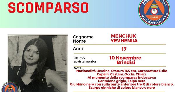 BRINDISI - Le ricerche di Yevheniia Menchuk, la ragazza ucraina di 17 anni scomparsa la sera del 10 novembre da un istituto di formazione cittadino, proseguono senza interruzioni. Fin dai primi minuti successivi alla denuncia, gli organismi previsti dal Piano provinciale di ricerca delle persone scomparse sono stati mobilitati per rintracciare la giovane, attivando una rete che comprende tutte le strutture operative impegnate in casi analoghi.