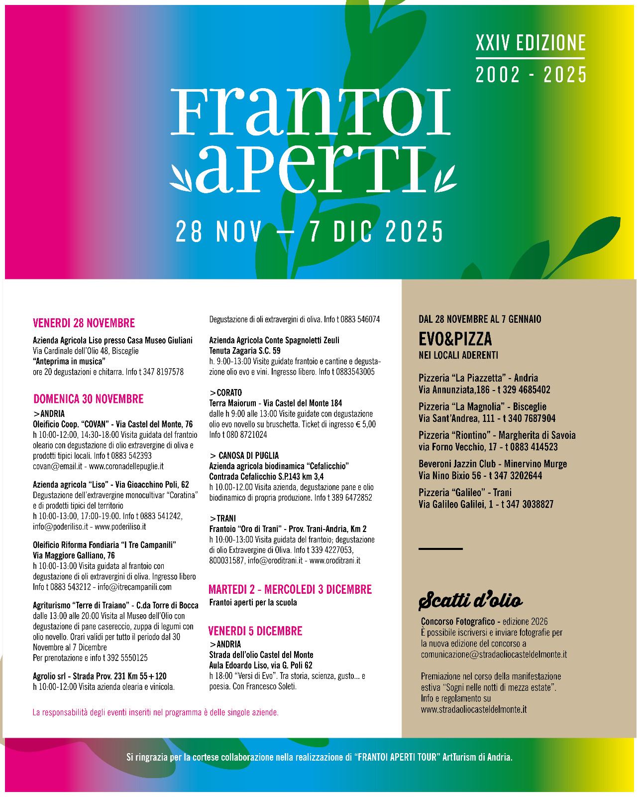 Il presidente della Strada dell’Olio extravergine d’oliva Castel del Monte, Nunzio Liso, sottolinea che questa edizione vede il coinvolgimento diretto anche del mondo della ristorazione grazie al progetto EVO&PIZZA, nato per valorizzare l’olio extravergine nell’arte culinaria. Alle pizzerie selezionate è stato chiesto di creare una pizza dedicata, pensata per esaltare il profilo sensoriale degli extravergini del territorio, frutto di diverse cultivar e blend. Le pizze EVO&PIZZA si potranno ordinare fino al 7 gennaio 2026 e sono già consultabili sui canali Facebook e Instagram della Strada dell’Olio Extravergine Castel del Monte.