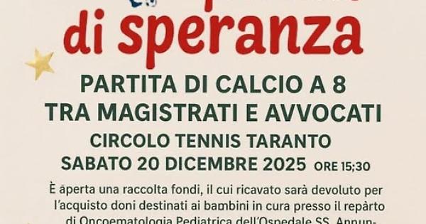 La partita "Un pallone di speranza" si terrà, alle ore 15.30 di sabato 20 dicembre, presso il Circolo Tennis di Taranto, un’occasione per “tifare” e sostenere dal vivo l’iniziativa benefica con un contributo (Info Adriano: 349.5526890).
