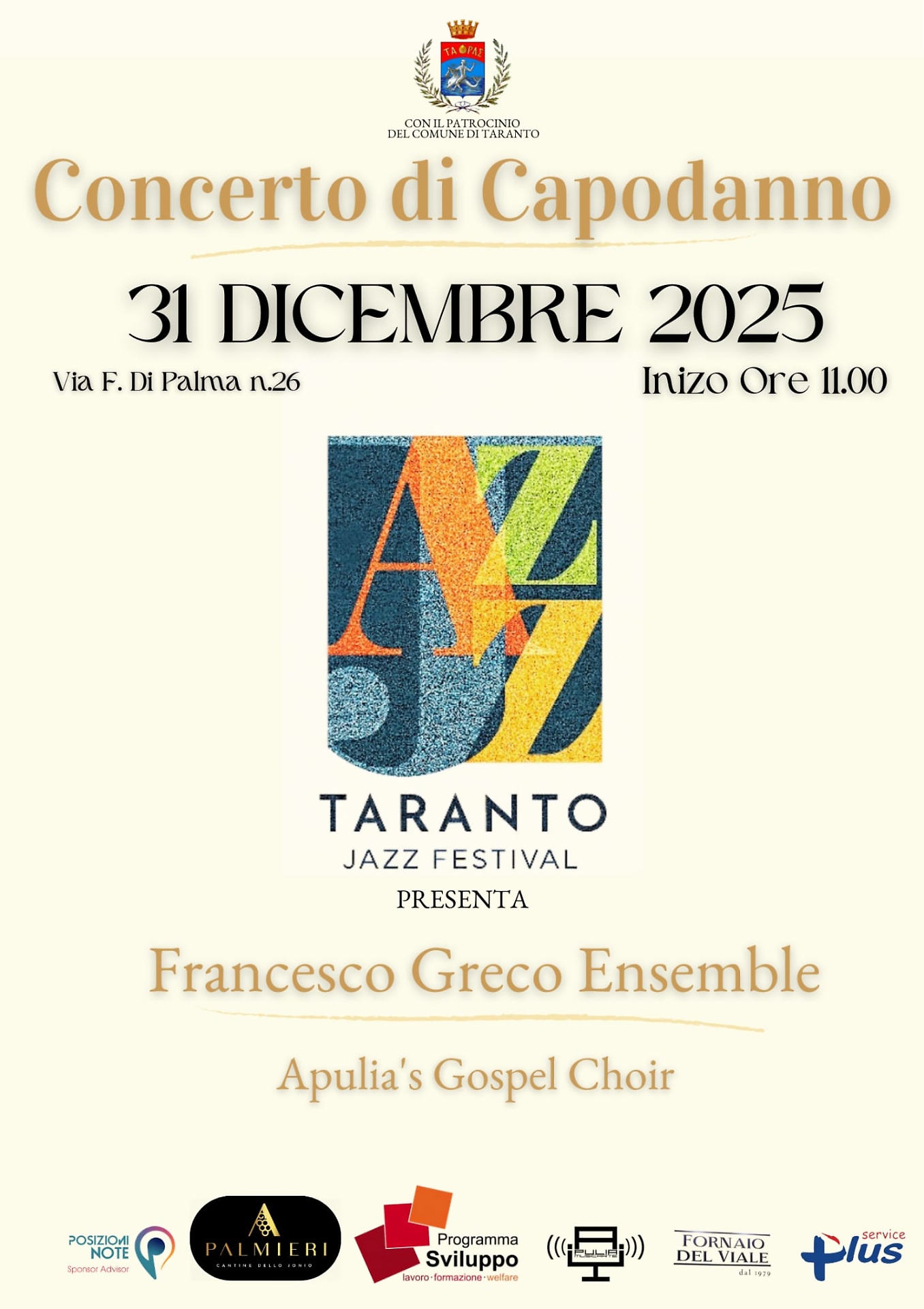Più raffinate le performance musicali che saranno offerte dal “Taranto Jazz Festival”, coordinate da Antonio Oliveti, con il patrocinio del Comune, in via Di Palma, nei pressi di via Pupino, dove, dalle ore 11 alle ore 13 circa, si esibiranno un gruppo gospel con i coristi ai balconi e il violinista Francesco Greco.