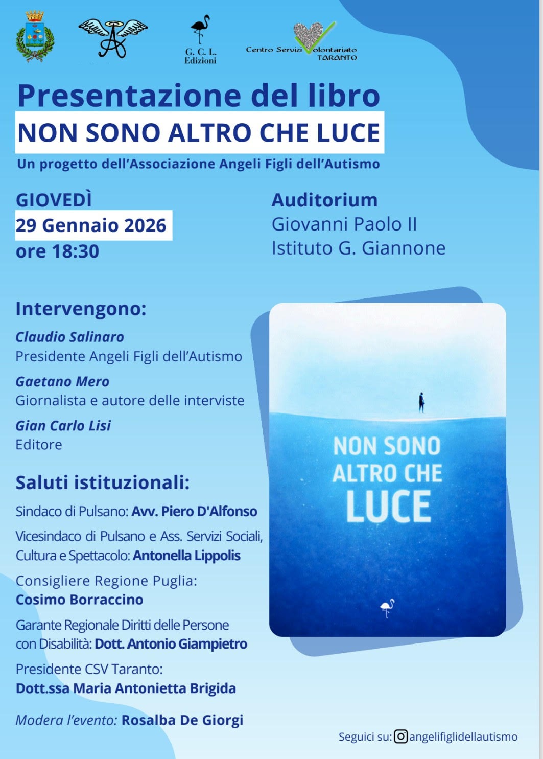PULSANO - Dare voce alle famiglie, raccontare esperienze spesso invisibili e trasformare le storie personali in uno strumento di consapevolezza collettiva. Nasce con questo obiettivo il libro “Non sono altro che Luce”, promosso dall’Associazione Angeli figli dell’autismo, realtà impegnata da anni nel sostegno a chi vive quotidianamente la complessità dell’autismo.