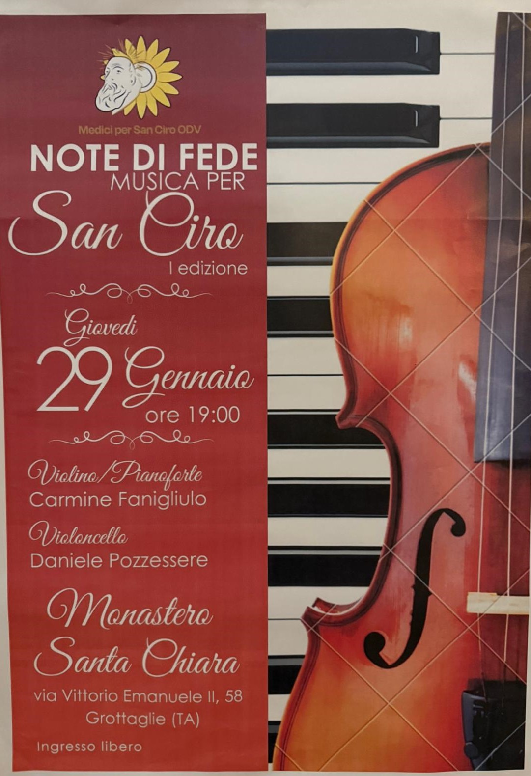 GROTTAGLIE - Musica, spiritualità e impegno solidale si incontrano nel cuore del centro storico di Grottaglie con la prima edizione di “Note di fede. Musica per San Ciro”, iniziativa promossa dall’associazione Medici per San Ciro ODV. L’appuntamento è in programma giovedì 29 gennaio alle ore 19.00 nel Monastero di Santa Chiara, in via Vittorio Emanuele II 58.