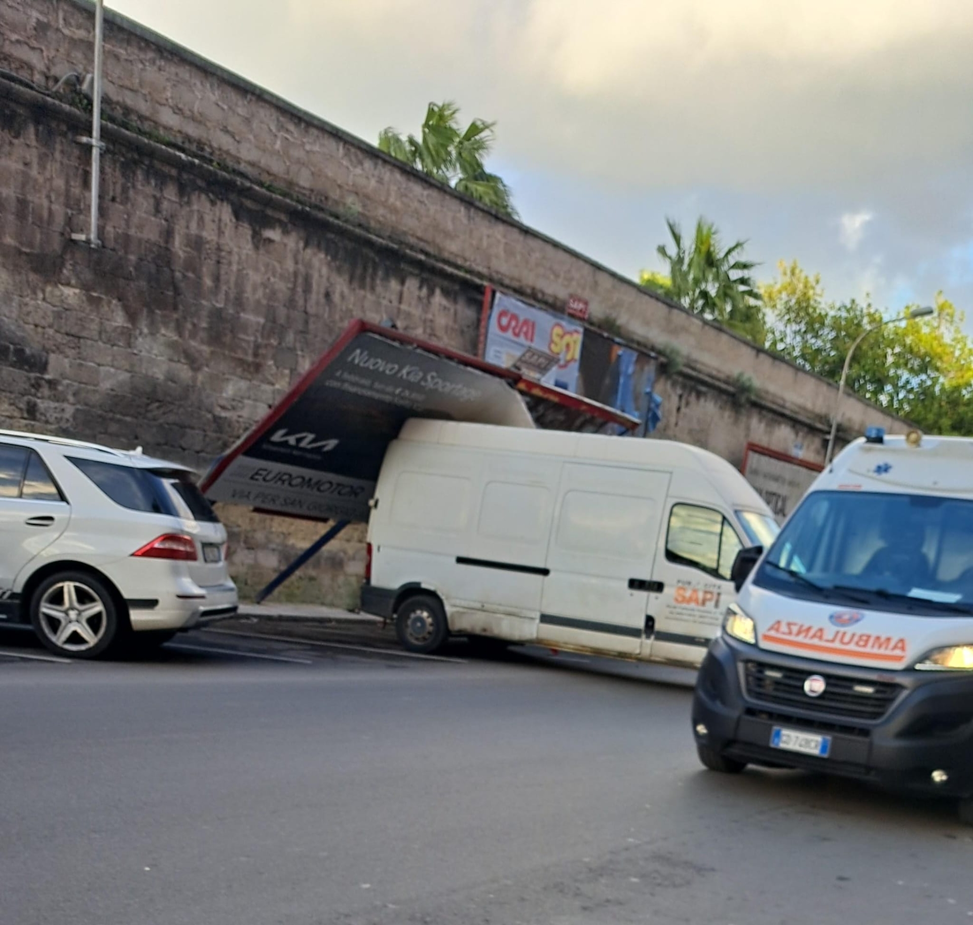 Ma non è tutto: anche due auto, una Scénic e una 307, sono stati colpiti da un cartellone pubblicitario abbattuto dal vento in via Cugini. Circostanza che fa salire ulteriormente il livello di attenzione. Le raffiche di vento, infatti, rischiano di abbattere alberi, pali pericolanti, cartelloni pubblicitari e persino oggetti pesanti custoditi sui balconi degli edifici. Per cui è il caso che tutti prestino la massima attenzione.