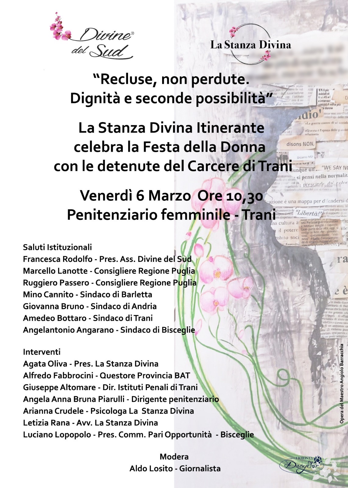 La locandina realizzata dall'artista di Divine del Sud, il maestro Angiolo Barracchia, richiama il quadro da lui realizzato, esposto nella Stanza Divina, donata dal Questore Fabbrocini, nel Commissariato di Polizia di Barletta