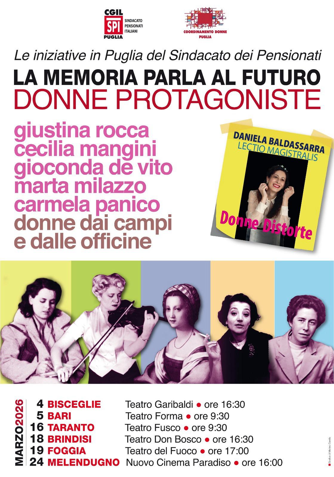 Al centro dell’appuntamento di Bisceglie è prevista la lectio magistralis Donne distorte, affidata a Daniela Baldassarra. Interverranno inoltre Lilli Arbore, presidente della Sezione Lavoro del Tribunale di Trani, Filippo Labellarte, già presidente della seconda sezione civile della Corte d’Appello di Bari, Roberta Gisotti, giornalista e scrittrice, Francesco Mastroroberti, ordinario di Storia del diritto italiano all’Università di Bari, e Tania Scacchetti, segretaria generale dello Spi Cgil nazionale.