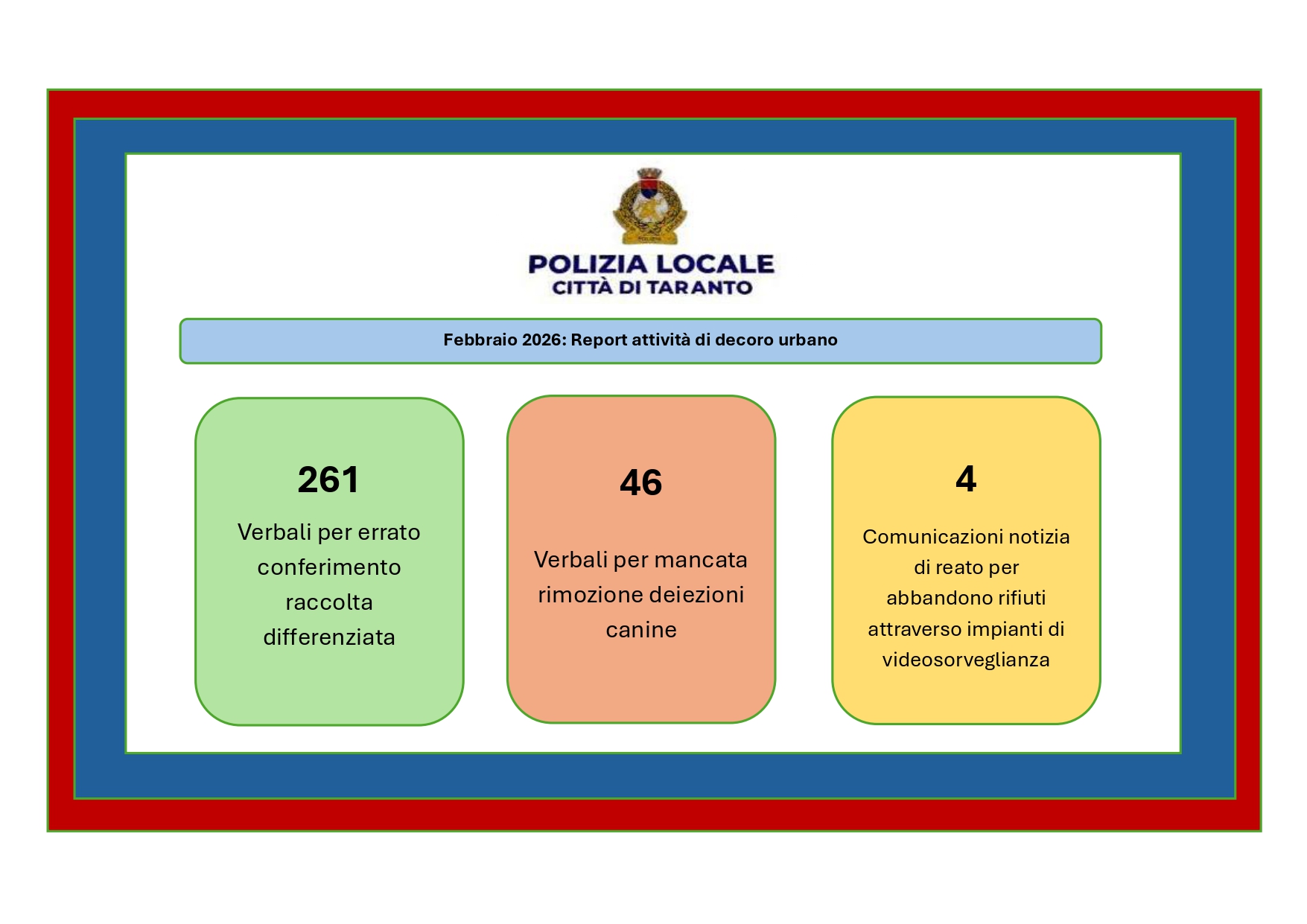 TARANTO – Sono 261 i verbali elevati nel mese di febbraio 2026 per errato conferimento della raccolta differenziata. È il dato principale che emerge dal report sulle attività di decoro urbano diffuso dal Comune di Taranto.