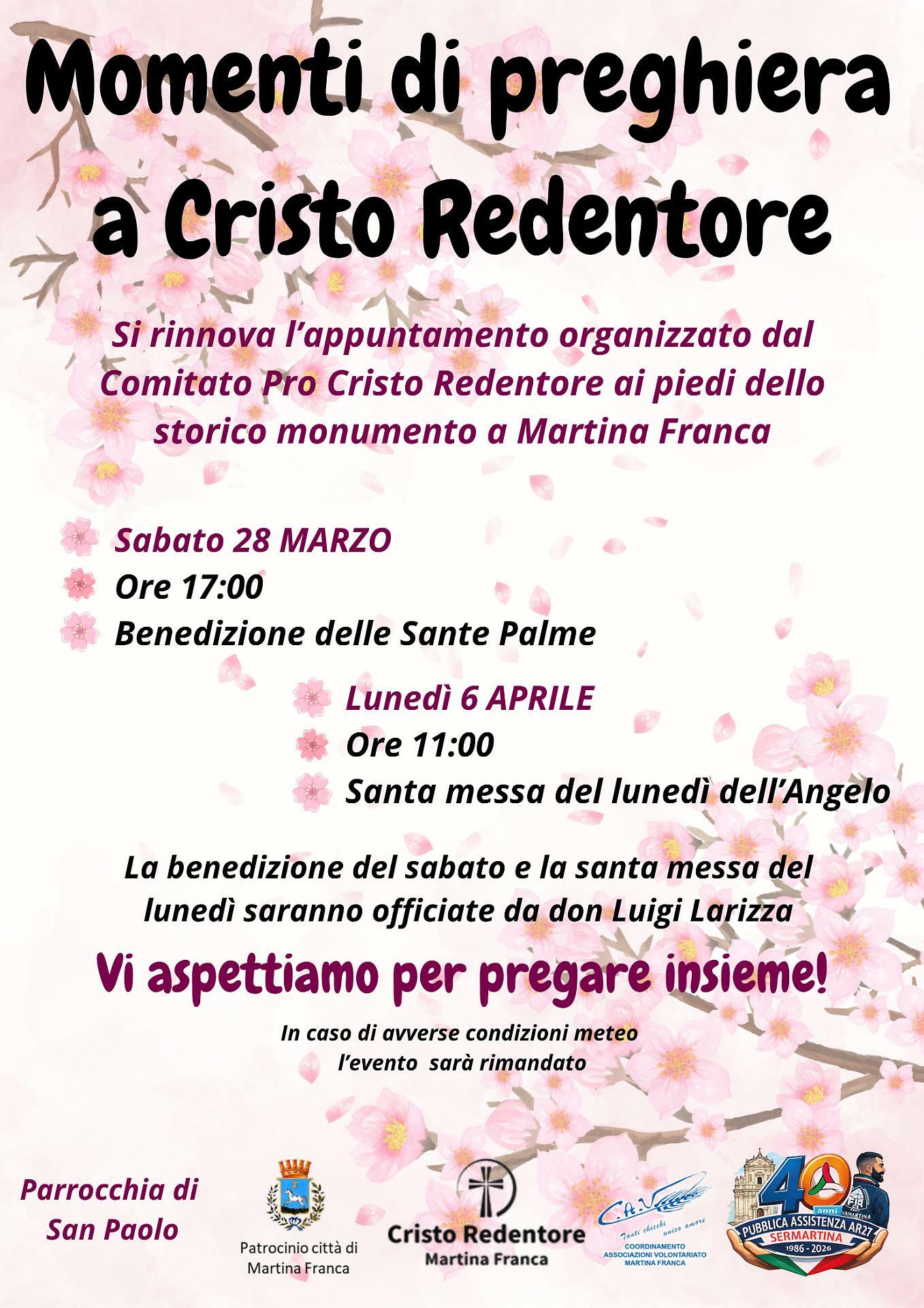 MARTINA FRANCA – Si rinnova anche per quest’anno l’iniziativa dei “Momenti di preghiera a Cristo Redentore”, promossa dal Comitato Pro Cristo Redentore e organizzata nello spazio antistante il monumento simbolo della città.