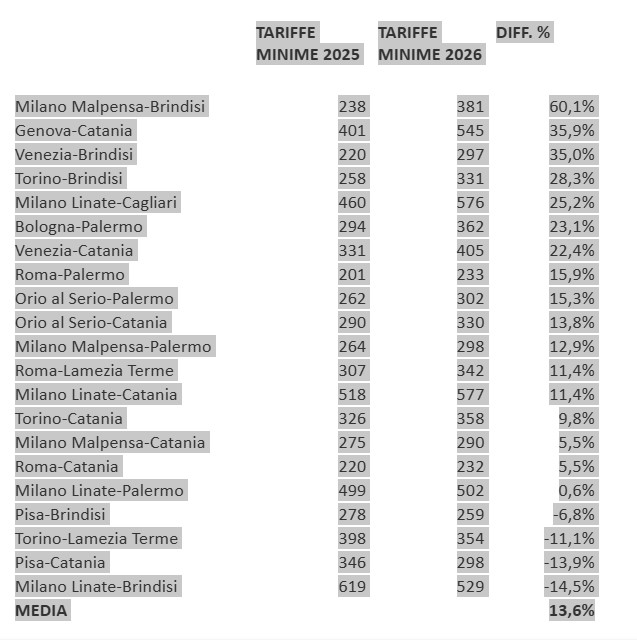 Poche le eccezioni in controtendenza. Secondo quanto rilevato da Assoutenti, registrano una diminuzione i voli Milano Linate-Brindisi e Pisa-Catania, entrambi con un calo del 14%, seguiti dalla Torino-Lamezia Terme con -11% e dalla Pisa-Brindisi con -6,8%.