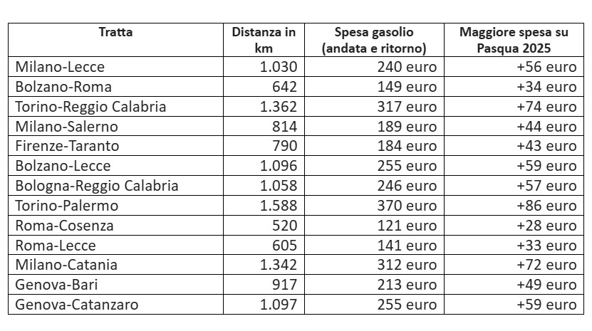 Il confronto con lo scorso anno evidenzia ulteriori rincari. “Se si guarda alla Pasqua 2025 – aggiunge Melluso – si scopre che oggi il costo dei rifornimenti è più alto di 86 euro sulla tratta Torino-Palermo e di oltre 70 euro per chi viaggia da Milano a Catania o da Torino a Reggio Calabria”.