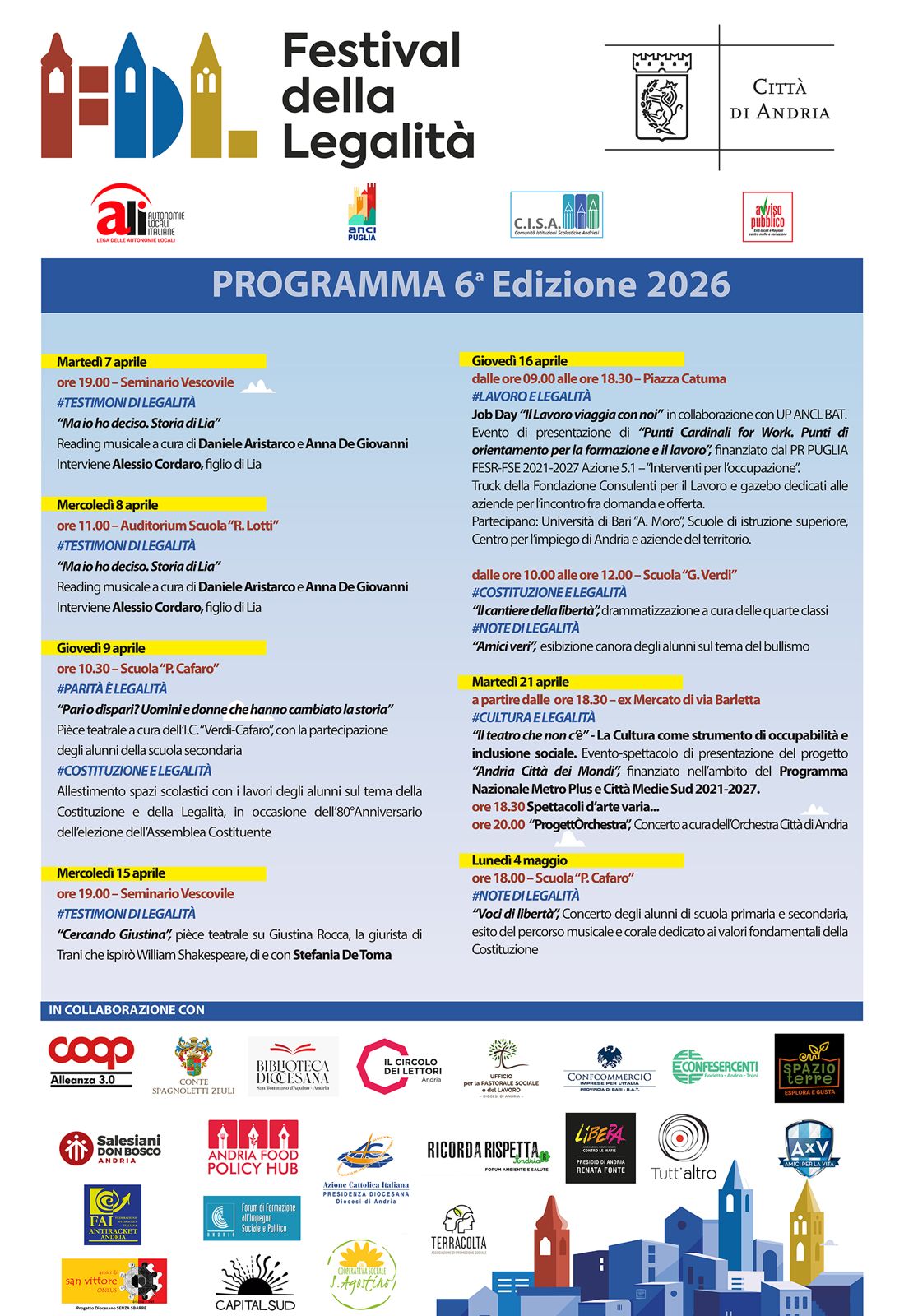 Martedì 21 aprile – a partire dalle ore 18.30 ex Mercato di via Barletta #CulturaÈLegalità – “Il teatro che non c’è” – La cultura come strumento di occupabilità e inclusione sociale”. Presentazione del progetto "Andria Città dei Mondi", spettacoli di arte varia e, alle ore 20.00, concerto della "ProgettOrchestra".