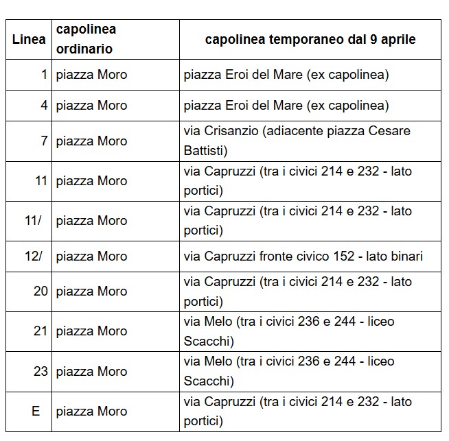 in direzione via Capruzzi: i bus giunti in via Scipione l’Africano impegneranno piazza Giulio Cesare e proseguiranno su viale Salandra, a destra per il differito capolinea di via Capruzzi