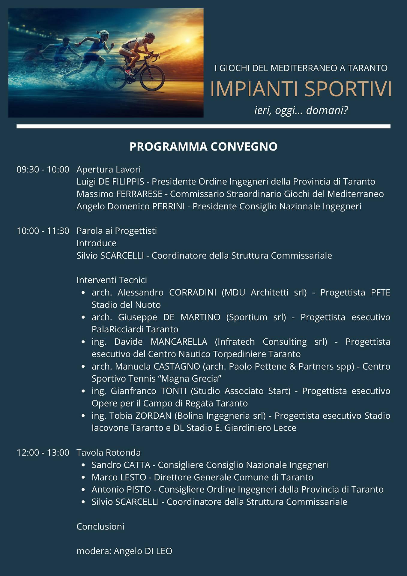 Ad aprire i lavori saranno figure di primo piano del settore. Previsti gli interventi di Luigi De Filippis, presidente dell’Ordine degli Ingegneri della provincia di Taranto, Massimo Ferrarese, commissario straordinario dei Giochi del Mediterraneo, e Angelo Domenico Perrini, presidente del Consiglio nazionale degli ingegneri.
