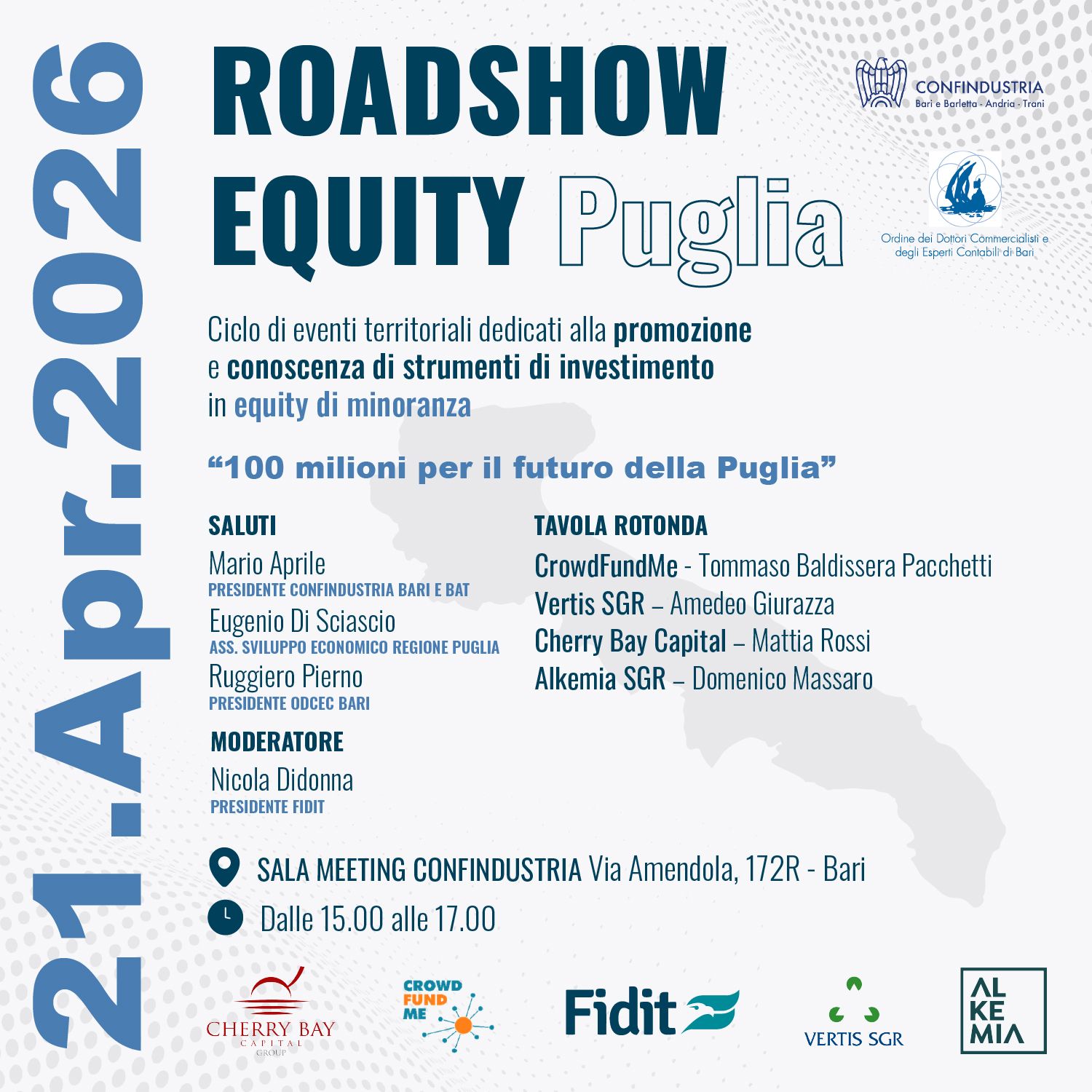 Il giorno successivo, martedì 21 aprile, il roadshow farà tappa a Bari, con un incontro previsto alle 15 nella sede di Confindustria Bari e Barletta Andria Trani in via Amendola. In questa occasione sono attesi, tra gli altri, il presidente di Confindustria Bari e BAT Mario Aprile, l’assessore regionale allo Sviluppo economico Eugenio Di Sciascio e il presidente dell’Ordine dei Commercialisti di Bari Ruggiero Pierno, insieme ai rappresentanti dei fondi coinvolti.