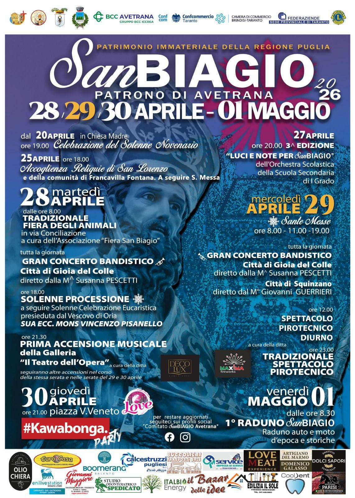 Il programma religioso si concentra in particolare nelle giornate del 28 e 29 aprile. Il 28 aprile sarà dedicato alla fede, con la solenne processione prevista alle ore 18 lungo le vie cittadine, seguita dalla celebrazione eucaristica presieduta dal vescovo della diocesi di Oria, Vincenzo Pisanello. In questa occasione si terrà anche il tradizionale rito della benedizione della gola, legato alla figura di San Biagio. Il giorno successivo, 29 aprile, spazio alla celebrazione eucaristica delle ore 19 con la venerazione della reliquia del patrono.