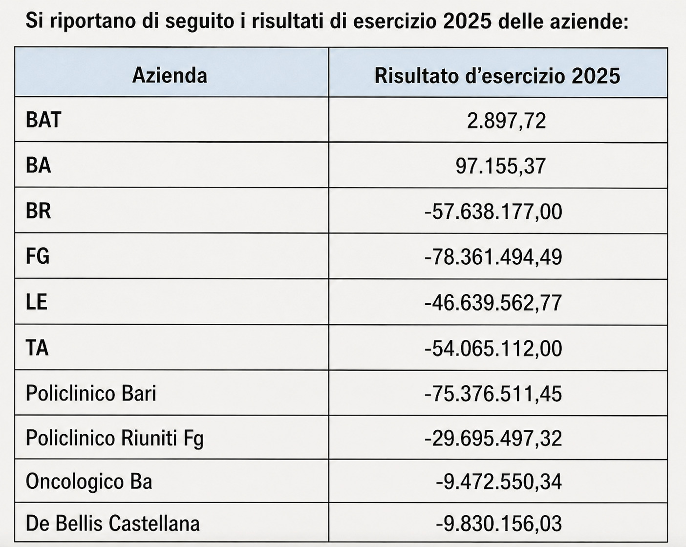 Per quanto riguarda i risultati economici delle singole realtà sanitarie, il quadro evidenzia una situazione differenziata sul territorio regionale. Tra i dati disponibili, si registrano risultati positivi limitati, come quello della Asl Bat con 2.897,72 euro, mentre le altre aziende presentano valori negativi.
