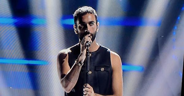 Marco Mengoni sul palcoscenico del Teatro Ariston durante la sua esibizione al Festival di Sanremo