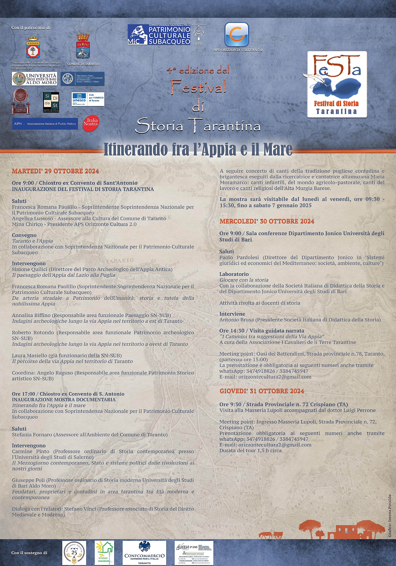 Si inizia martedì 29 ottobre, presso il Chiostro dell'ex Convento di Sant'Antonio, dove alle ore 9.00 ci sarà l'inaugurazione cui seguirà il convegno "Taranto e l'Appia"; nella stessa location alle 17.00 ci sarà l'inaugurazione della mostra documentaria "Itinerando tra l'Appia e il Mare".