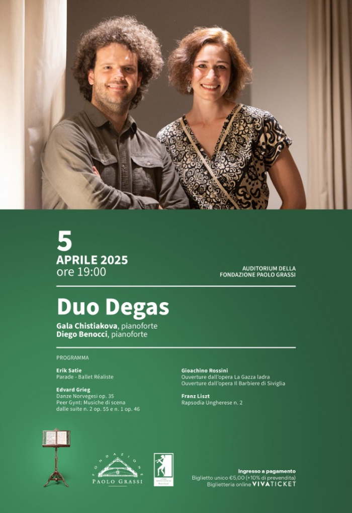 MARTINA FRANCA (TA) - Prosegue con successo la stagione concertistica del Centro Artistico Musicale “Paolo Grassi” che sabato, 5 aprile, alle ore 19:00, ospiterà il recital del Duo Degas presso l’Auditorium della Fondazione Paolo Grassi, in via Metastasio nr. 20. Il duo pianistico, composto da Gala Chistiakova e Diego Benocci, eseguirà un programma accuratamente selezionato dai repertori di due grandi compositori: Edvard Grieg e Gioachino Rossini. Costo del biglietto unico di 5,00 euro (più il 10% di prevendita), online su Vivaticket. Ingresso gratuito per i bambini under 12 e persone con disabilità. Info ai numeri 080:4306763 e al 334 6075833.