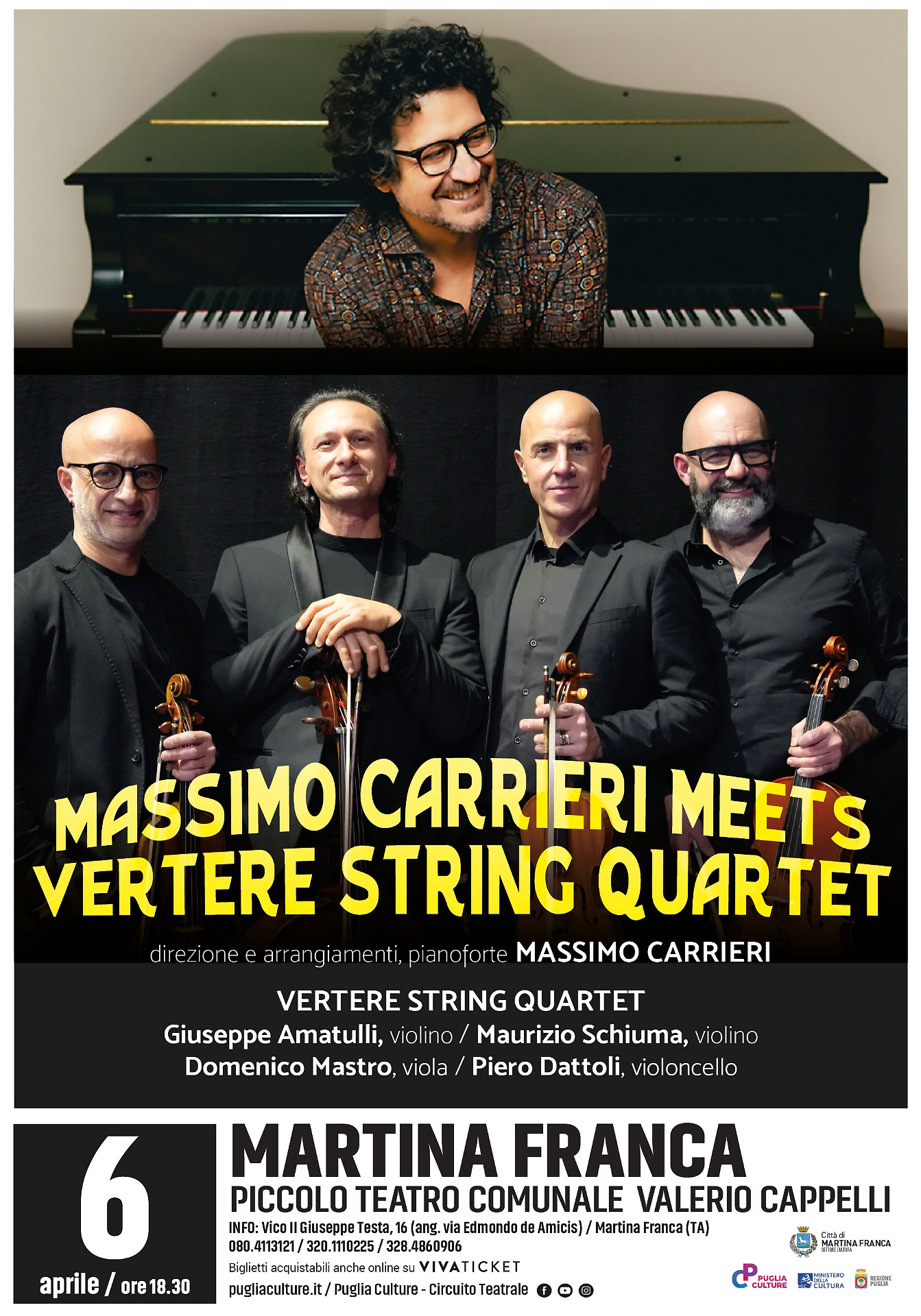 MARTINA FRANCA (TA) - Per la stagione teatrale e di musica “Il talento è di casa”, organizzata dal Comune di Martina Franca in collaborazione con Puglia Culture al Piccolo Teatro Comunale Valerio Cappelli (Vico II Giuseppe Testa, 16) domenica, 6 aprile, è di scena la musica colta con Massimo Carrieri e il Vertere String Quartet formato da Giuseppe Amatulli, Maurizio Schiuma, Domenico Mastro e Piero Dattoli. Il concerto è un viaggio musicale che attinge ai più grandi compositori di area jazz del nostro secolo. Biglietti online su VivaTicket e presso il botteghino del Teatro tutti i lunedì e giovedì dalle ore 18.00 alle ore 21.00 e il giorno dello spettacolo dalle ore 18.00. Inizio ore 18,30.