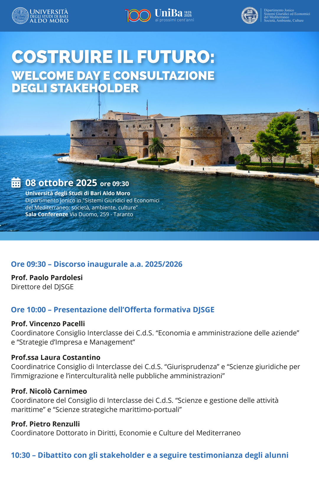 Mercoledì 8 ottobre 2025, a partire dalle ore 9,30, nella Sala Conferenze del Dipartimento Jonico in “Sistemi giuridici ed economici del Mediterraneo: società, ambiente, culture” dell’Università degli Studi di Bari Aldo Moro (Taranto, via Duomo 259), verrà presentata l’offerta formativa del Dipartimento e si terrà la Consultazione degli stakeholder dei corsi di Laurea e del Dottorato di ricerca del Dipartimento Jonico.