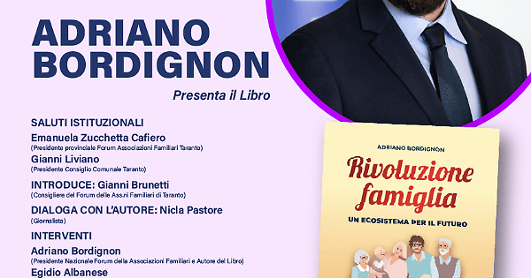 "Rivoluzione Famiglia- Un ecosistema per il futuro' di Adriano Bordignon, presidente nazionale del Forum delle associazioni familiari, è il titolo del libro che sarà presentato questa sera venerdì 7 novembre alle ore 19 nella sala 'Laudato si' della chiesa del Cuore Immacolato di Maria, a Taranto. Organizzano il Forum delle associazioni familiari di Puglia e il Forum delle associazioni familiari della provincia jonica con il patrocinio di Comune, Arcidiocesi, Ufficio pastorale familiare e Ufficio pastorale sociale e del lavoro della diocesi.