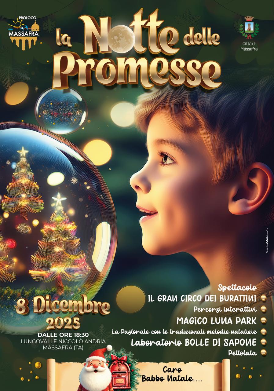 MASSAFRA (TA) – L'atmosfera natalizia nel Tarantino raggiunge uno dei suoi apici più attesi oggi, 8 dicembre, giorno dell'Immacolata Concezione. A Massafra, la Pro Loco Città locale ha organizzato la "Notte delle promesse", un evento interamente dedicato alla magia delle feste, in programma a partire dalle ore 18:30 lungo il Lungovalle Niccolò Andria.