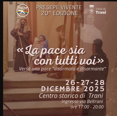 TRANI (BAT) – A Trani il centro storico si fa teatro di una Sacra Rappresentazione. Il Presepe vivente, intitolato "La Pace sia con tutti Voi" e ispirato al primo discorso di Papa Leone XIV, animerà le vie antiche a partire da oggi 26 e fino al 28 dicembre (dalle 17:00 alle 20:30), in un percorso tra mestieri dimenticati e spiritualità.