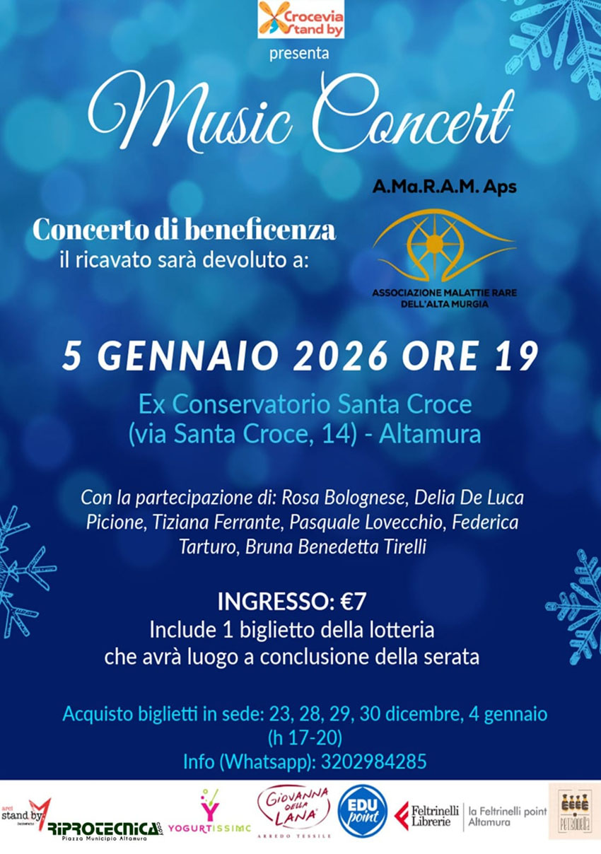 ALTAMURA (BA) – La vigilia dell'Epifania ad Altamura si tinge di solidarietà con un appuntamento che trasforma l’arte in un gesto concreto di vicinanza: alle ore 19:00 di oggi, lunedì 5 gennaio, le volte storiche dell’Ex Conservatorio Santa Croce (in via Santa Croce, 14) apriranno le porte al "Music Concert", una serata di beneficenza nata dalla sinergia tra Crocevia Stand By e l’associazione A.Ma.R.A.M. APS.