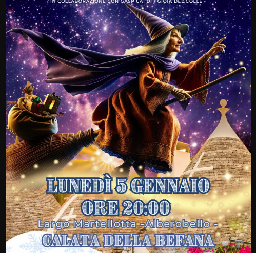 ALBEROBELLO (BA) – Il profilo della Chiesa di Santa Lucia come punto di partenza e il cuore di Largo Martellotta come traguardo. Lunedì 5 gennaio, alle ore 20:00, Alberobello rinnova uno dei riti più spettacolari dell’inverno pugliese: la Calata della Befana. Inserito nel programma “We Are in Trulli Xms ed.” e parte integrante del Villaggio Enogastronomico, l'evento trasformerà la Capitale dei Trulli in un teatro a cielo aperto dove la tradizione si mescola all'adrenalina.