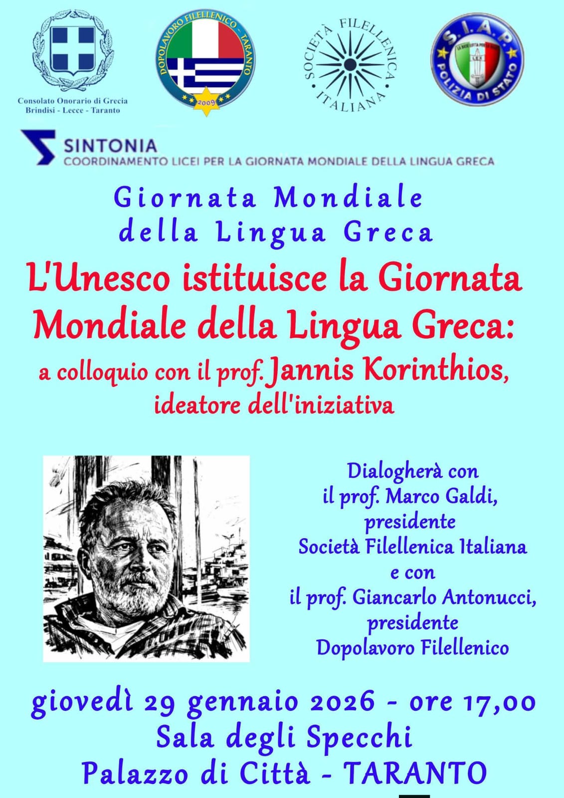 Giovedì 29 gennaio con inizio alle ore 17,00 il prof. Jannis Korinthios sarà a Taranto ospite del Dopolavoro Filellenico e nella Sala degli Specchi a Palazzo di Città racconterà il lungo e impegnativo percorso che ha portato al prestigioso riconoscimento, ripercorrendone le tappe.