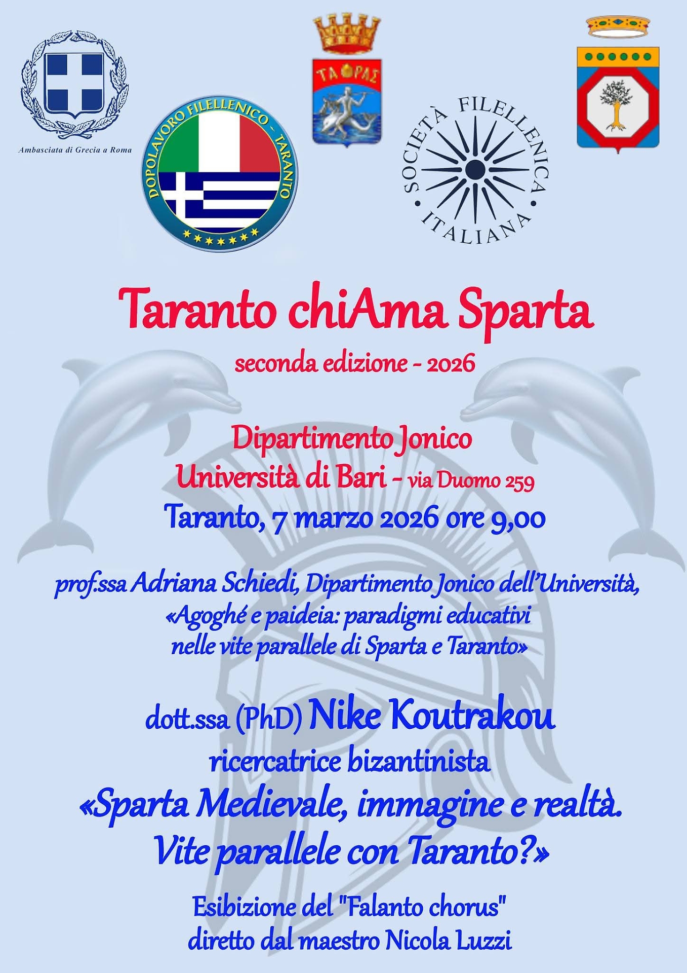 La seconda edizione della manifestazione «Taranto chiAma Sparta» si terrà il prossimo 7 marzo nell’aula magna dell’Università in Città Vecchia a Taranto. Organizzatrici sono le associazioni culturali Dopolavoro Filellenico che a Taranto opera fin dal 2009 ed è presieduta dal prof. Giancarlo Antonucci, docente nei licei a Taranto e la Società Filellenica Italiana che ha sede a Cava de’ Tirreni ed è presieduta dal prof. Marco Galdi, docente di Diritto Pubblico all’Università di Salerno. Per questa seconda edizione, relatrice sarà la dott.ssa (PhD) Nike Koutràkou, storica bizantinista nonché diplomatica: già consigliere culturale all’Ambasciata di Roma, poi Ambasciatore di Grecia in Algeria, attualmente è Consigliere Diplomatico del sindaco di Atene, Ministro Plenipotenziario ad honorem ed è socia onoraria del Dopolavoro Filellenico.