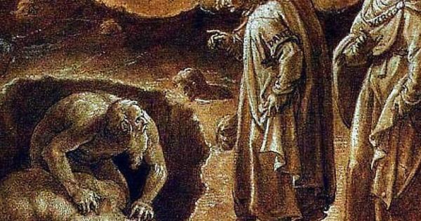 Il nostro poeta, dopo aver attraversato la prima zona detta Caina, giunge nella seconda, l’Antenore dove trova Bocca degli Abati, anch’egli traditore, ma ancora più avanti Dante osserva due ombre, conficcate nella pianura ghiacciata, una delle quali rode, con i suoi denti, il cranio dell’altro dannato.