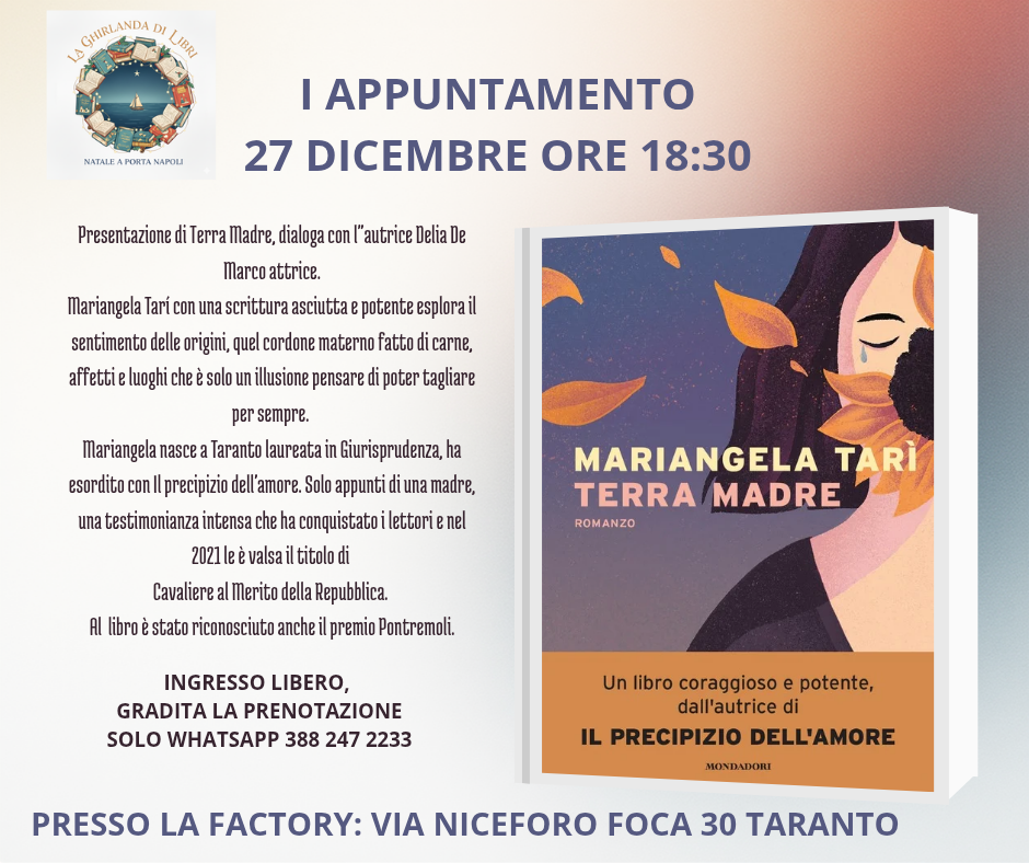 sabato 27 dicembre – ore 18:30 - Terra Madre (Mondadori) Presentazione con l’autrice Mariangela Tarì, dialoga Delia De Marco, attrice Un racconto corale di vite, memoria e legami profondi con la terra;