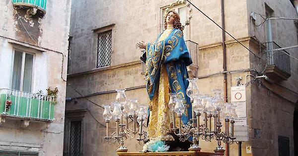 Venerdì 29 novembre, per l’inizio della novena, alle ore 17.30 il venerato simulacro dell’Immacolata sarà portato dalla cattedrale al santuario della Madonna della Salute, accompagnato, oltre che dalla confraternita, dai Cavalieri di Malta e dalla banda “Santa Cecilia”. Dal 30 al 6 dicembre, la novena si svolgerà con il santo rosario alle ore 18 e la santa messa alle ore 18.30. Domenica 1 dicembre, alle ore 18.30, durante la celebrazione eucaristica, cerimonia di professione dei nuovi confratelli e consacrazione dei bambini all’Immacolata. Sabato 7 dicembre, in cattedrale, alle ore 17 avrà luogo il solenne Pontificale dell’arcivescovo. Domenica 8, alle ore 9.30 santa messa celebrata da mons. Emanuele Ferro, parroco della cattedrale e padre spirituale della confraternita; a seguire, la processione per le vie della città vecchia, con tutte le confraternite, i Cavalieri di Malta e la banda musicale “Santa Cecilia”, diretta dal maestro Giuseppe Gregucci. L’itinerario prevede una deviazione su corso Vittorio Emanuele per la presenza del cantiere di ristrutturazione a palazzo Carducci (facciata via Duomo): quindi dopo l’uscita s’imboccherà largo arcivescovado, corso Vittorio Emanuele, vico San Pietro Imperiale (davanti alla chiesa di San Domenico), pendio San Domenico, piazza Fontana, via Garibaldi, via Sant’Egidio, via Di Mezzo e rientro per via Duomo fino alla cattedrale.