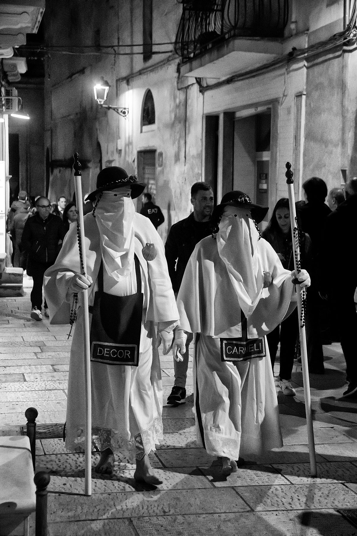 Il tratto distintivo di questo rito è il suo silenzio. Un silenzio che non è assenza di suono, ma presenza viva, interrotto solo dalle marce funebri e dai canti. Attorno alla Desolata si muove un corteo composto anche dai “piccoli crociferi”, bambini vestiti di bianco che portano una croce sulle spalle. Un’immagine che unisce generazioni e che affida ai più giovani il compito di custodire una tradizione secolare.