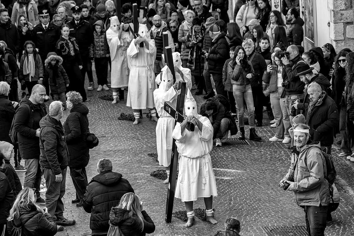 Il cuore più intenso della tradizione, però, resta il Venerdì Santo. La mattina è stata segnata dalla Processione delle Catene, uno dei riti più peculiari dell’intera Puglia. Cinque penitenti, vestiti con il saio bianco e incappucciati, hanno percorso le vie della città scalzi, portando sulle spalle pesanti croci lignee e trascinando catene ai piedi. Un gesto di penitenza che, secondo la tradizione, viene mantenuto per 5 anni, in riferimento alle piaghe di Cristo.