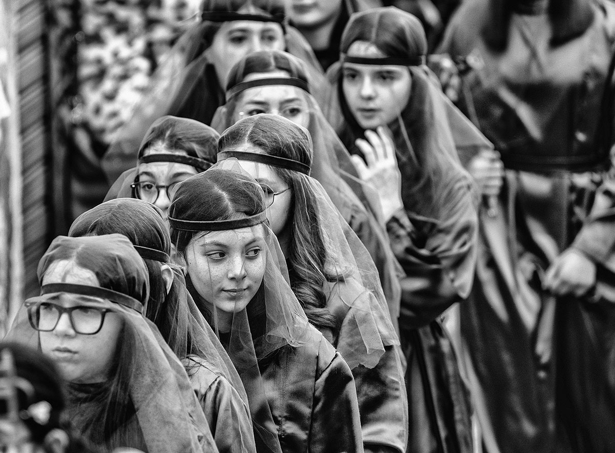 Poi arriva lei, la Vergine Desolata. La statua avanza lentamente, accompagnata da pali decorati con fiori. Ma è il suono a definire davvero questo momento. Un gruppo di ragazze, vestite di nero e con il volto coperto, intona lo Stabat Mater di Jacopone da Todi nella versione musicata da Antonio Lotti. Le voci si alzano in un canto che non è solo musica, ma narrazione del dolore, condivisione, appartenenza.