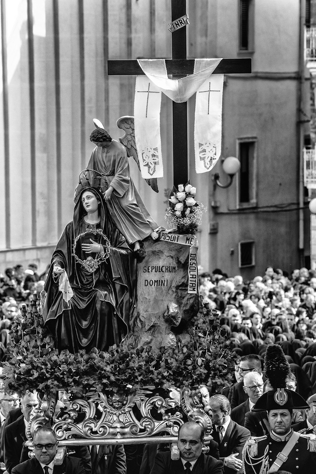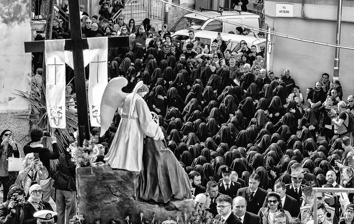 È un momento che segna l’ingresso nella dimensione più intima della Passione. La statua della Madonna, avvolta in un velo nero, si ferma prima di muoversi tra la folla. Attorno, migliaia di donne vestite di nero, con il volto coperto, intonano il Miserere. È un canto che non ha bisogno di spiegazioni, capace di riempire ogni spazio e di restituire il senso profondo di una devozione tramandata nel tempo.