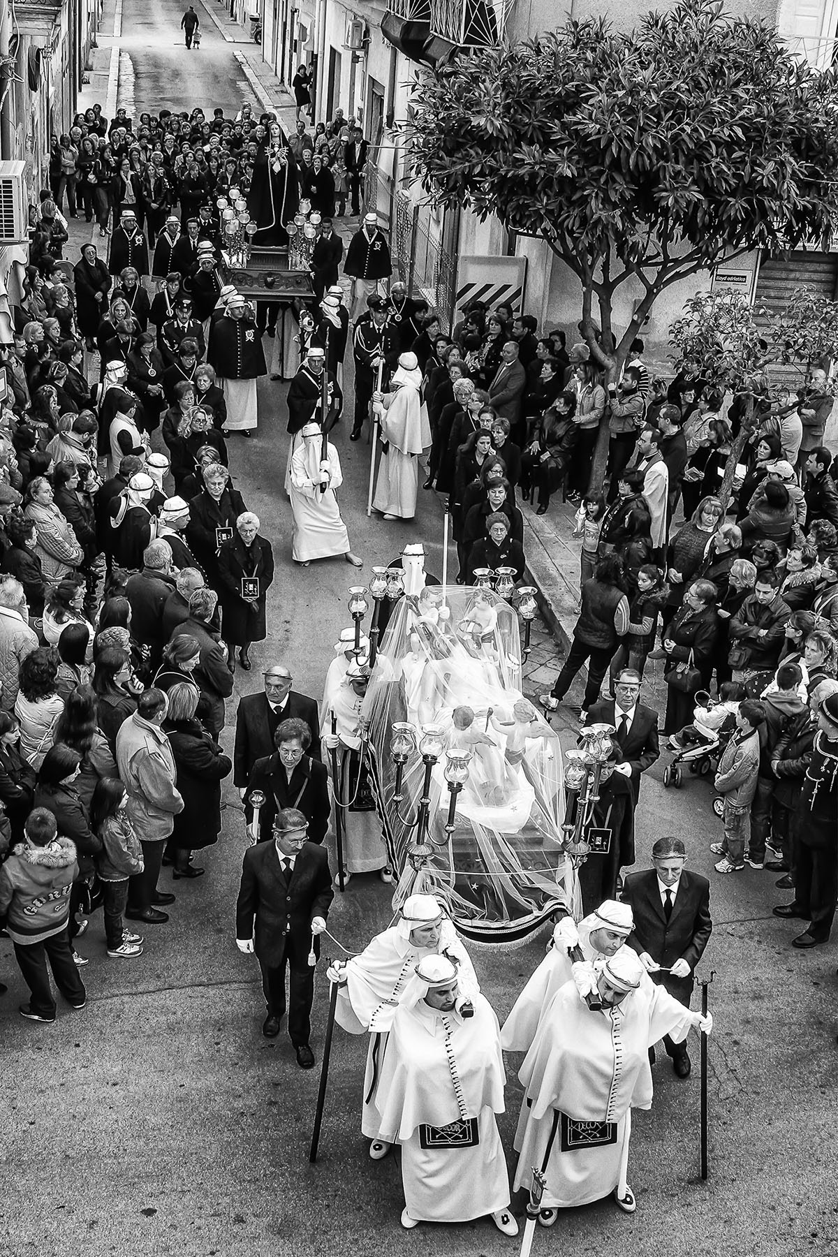 Apre il corteo la “troccola”, seguita dal gonfalone e dalla Croce dei Misteri. Caratteristica è la presenza di un “crocifero”, confratello che porta la croce sulle spalle, che prende posto innanzi alla statua del Crocifisso.