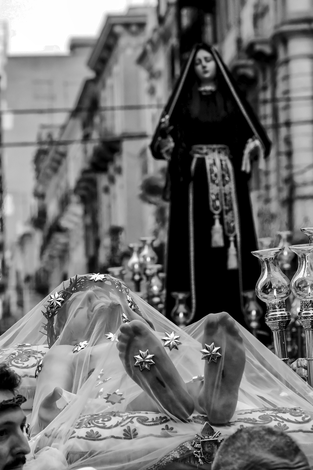 Sotto l’incessante luce dei flash dei fotografi, quando ormai è sera inoltrata, appare la stupenda immagine di Gesù Morto (accompagnata dall’”Inno a Cristo Morto” di Cacace) con ai lati i quattro “cavalieri”, nel ricordo della partecipazione di rappresentanti della nobile famiglia Calò, iniziatrice dei Riti tradizionali. Quindi, fa la sua comparsa l’Addolorata, dietro alla quale prende posto l’orchestra di fiati “Santa Cecilia-Città di Taranto”, reduce dalla processione rientrata poco prima in San Domenico, in un autentico tour de force. Compresi quelli “Giuseppe Chimienti di Montemesola e di Francavilla Fontana, sono quattro i complessi bandistici che sottolineano con le loro musiche le “nazzecate” dei confratelli.