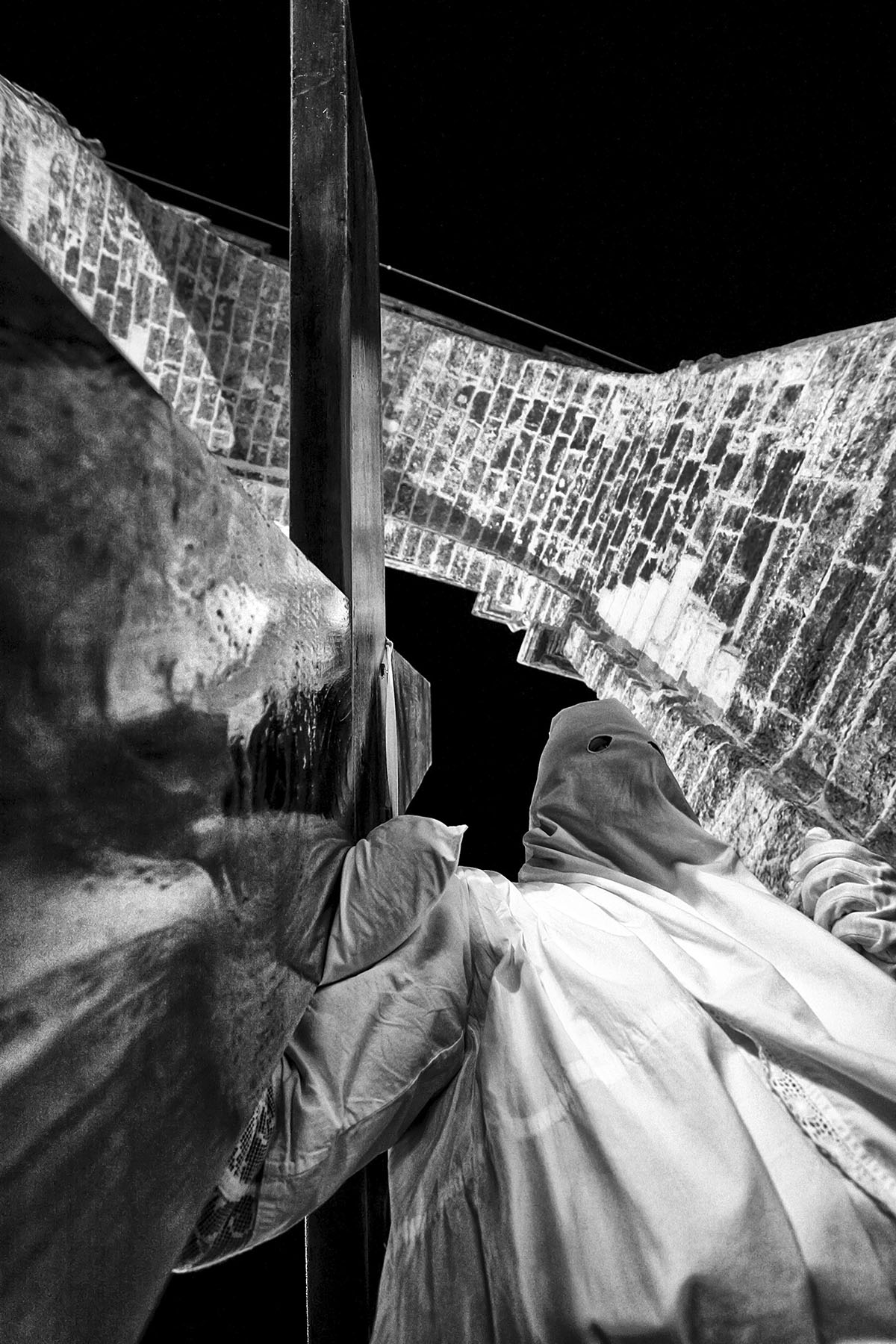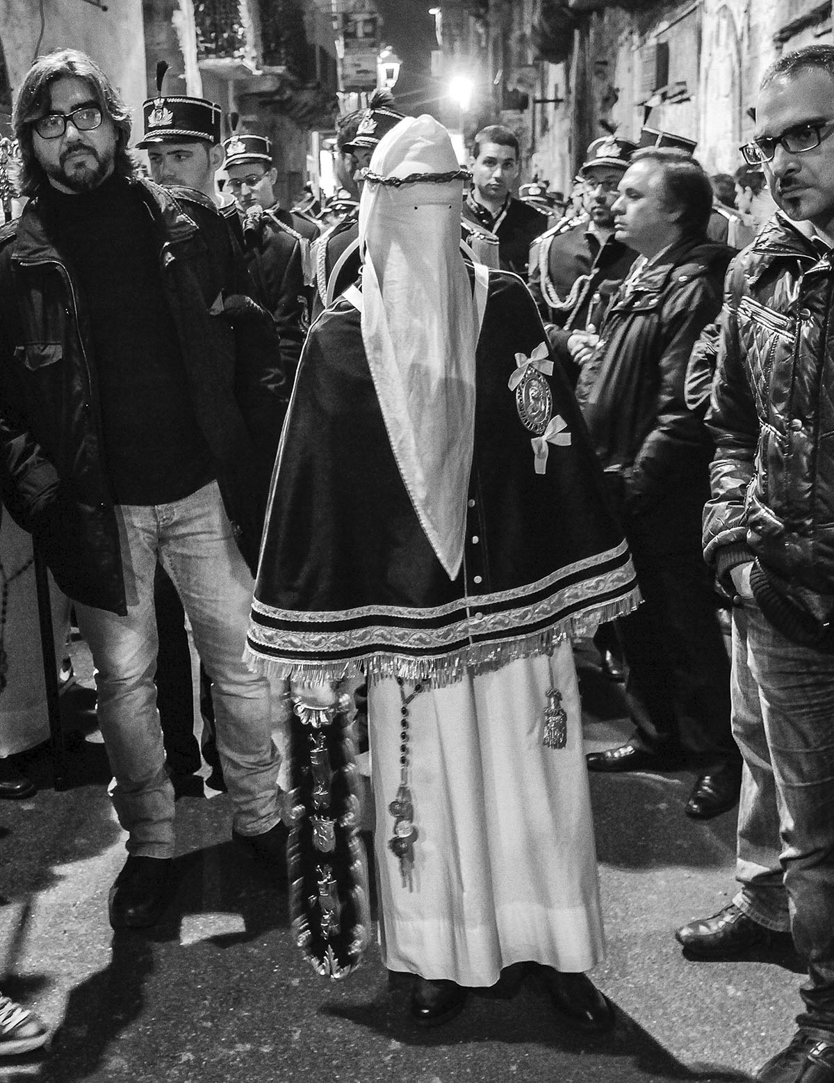 A Taranto, dove i riti hanno assunto nel tempo una forza quasi archetipica, la lunga notte dei Misteri continua a rappresentare uno dei momenti più intensi dell’intero Mezzogiorno. I perdoni avanzano con la loro nazzecata, le bande accompagnano il cammino della Passione, il troccolante apre la strada come una figura fuori dal tempo. La città si stringe lungo il percorso e aspetta l’alba davanti al Carmine, tra lacrime, fatica e appartenenza. Taranto non assiste soltanto ai riti, li abita. Ed è forse per questo che il loro racconto si prolunga anche nello sguardo fotografico.