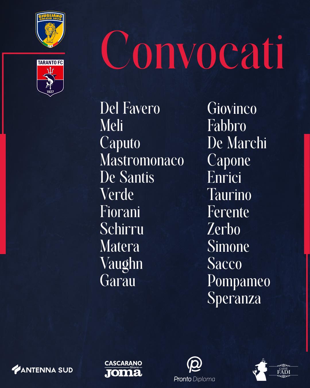 Del Favero; Mastromonaco, De Santis, Matera, Enrici; Verde, Fiorani, Schirru; Fabbro, De Marchi, Garau l'undici iniziale del Taranto di stasera. Bertotto, mister del Giugliano, ha schierato Barosi; Valdesi, Solcia, Caldore, Oyewale; Romano, Celeghin, Giorgione; Masala, Padula, Giorgione.