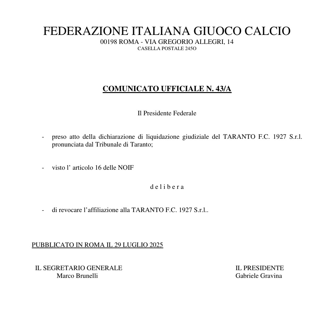 Affiliazione revocata. Per la Figc, la Federazione italiana gioco calcio, il Taranto FC 1927 non esiste più: un passaggio formale fondamentale per la ripartenza del calcio rossoblù dal torneo di Eccellenza, con una nuova società che verrà scelta tramite una manifestazione di interesse gestita dal Comune.
