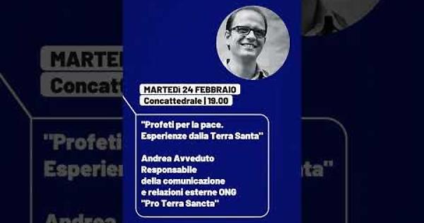 Martedì 24 febbraio, “Profeti per la pace. Esperienze dalla Terra Santa” sarà il tema che svilupperà Andrea Avveduto, giornalista, responsabile della comunicazione e relazioni esterne della ong “Pro Terra Sancta”. Ha pubblicato i seguenti libri: “Aggrappati alle radici. Storie e volti dei cristiani in Terra Santa”; “Kikot, la partita più importante”, “L’ora prima del miracolo” e “Un Maestro per Samir”.