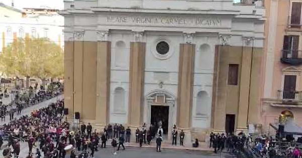TARANTO -Alle ore 17 in piazza Giovanni XXIII il “troccolante” si è affacciato sulla soglia della chiesa del Carmine per dare avvio alla commovente processione dei Sacri Misteri a cura dell'arciconfraternita del Carmine.